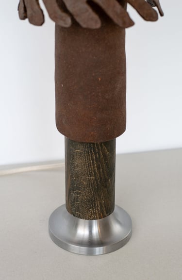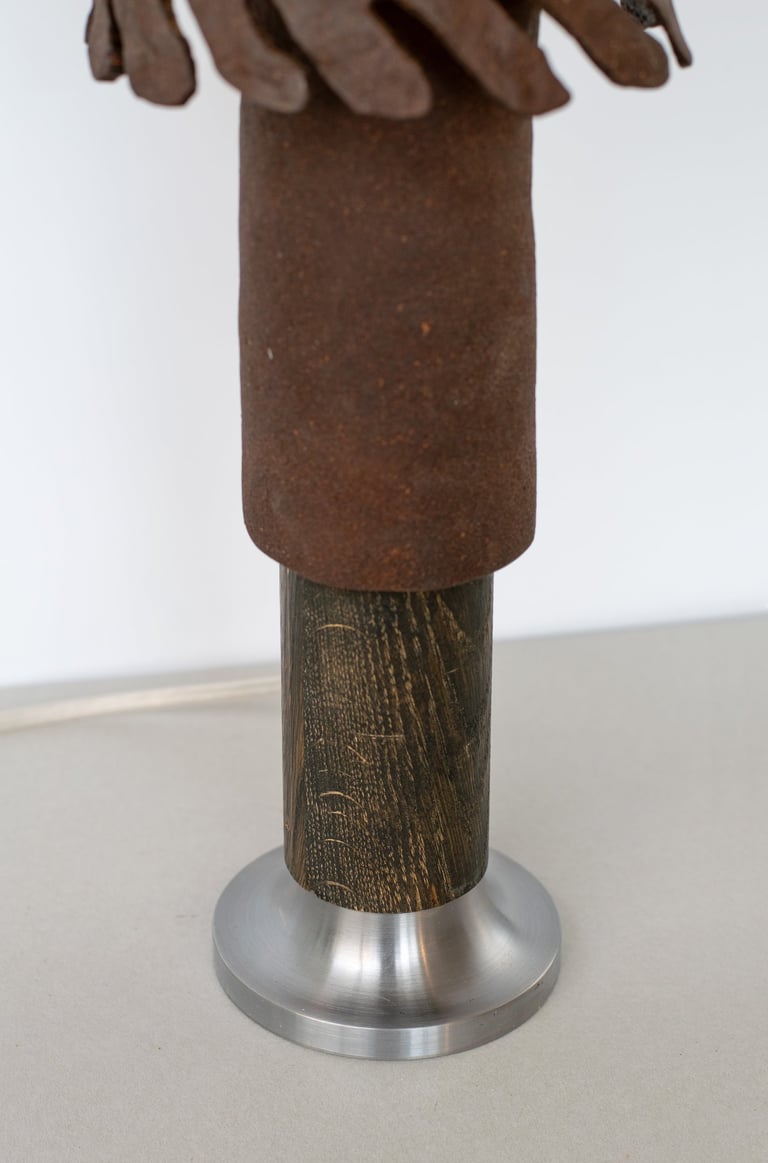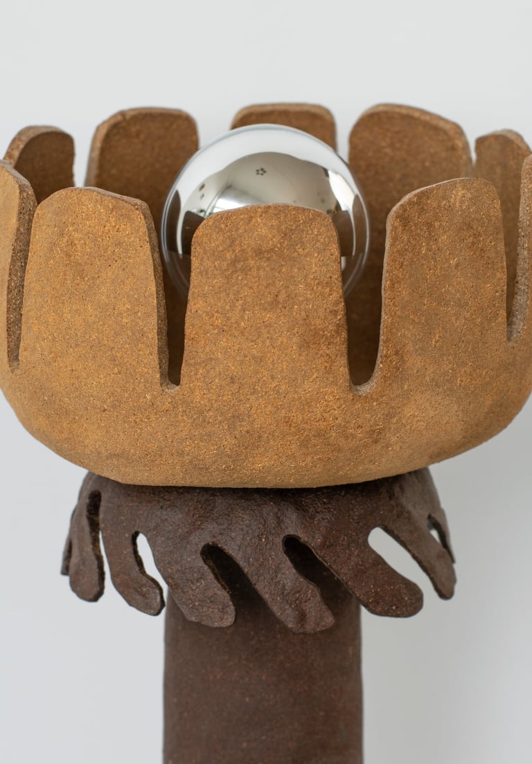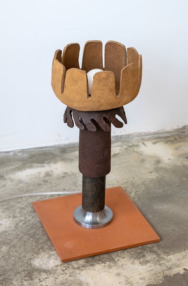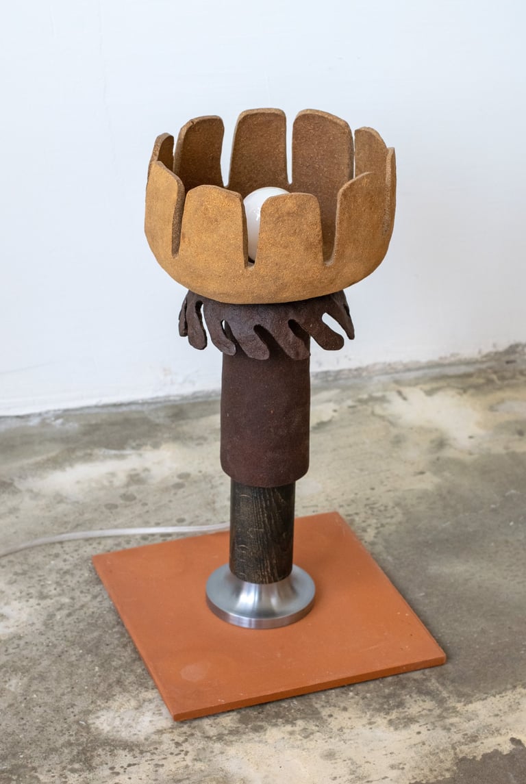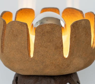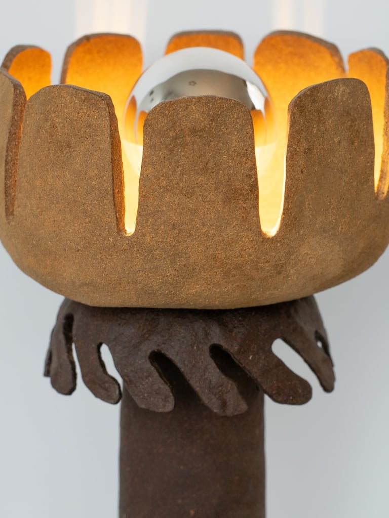 The lamp is made primarily from a reclaimed tree bark bio-composite material that designer developed, allowing the natural characteristics of the material to guide the final form and texture of the piece. The material is highly tactile and, once dried, resembles ceramics. When used with a light source, it emits a warm and soft glow.