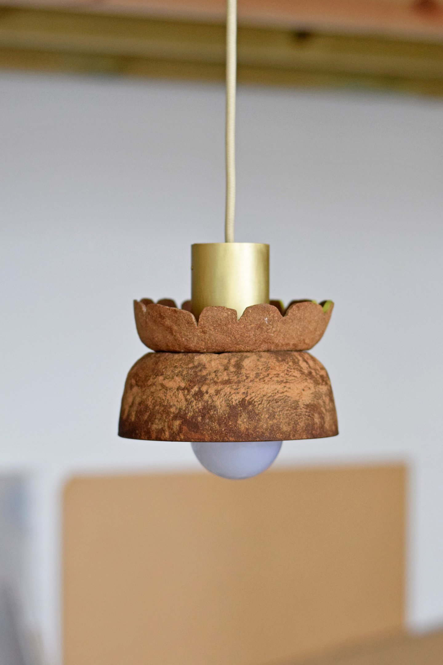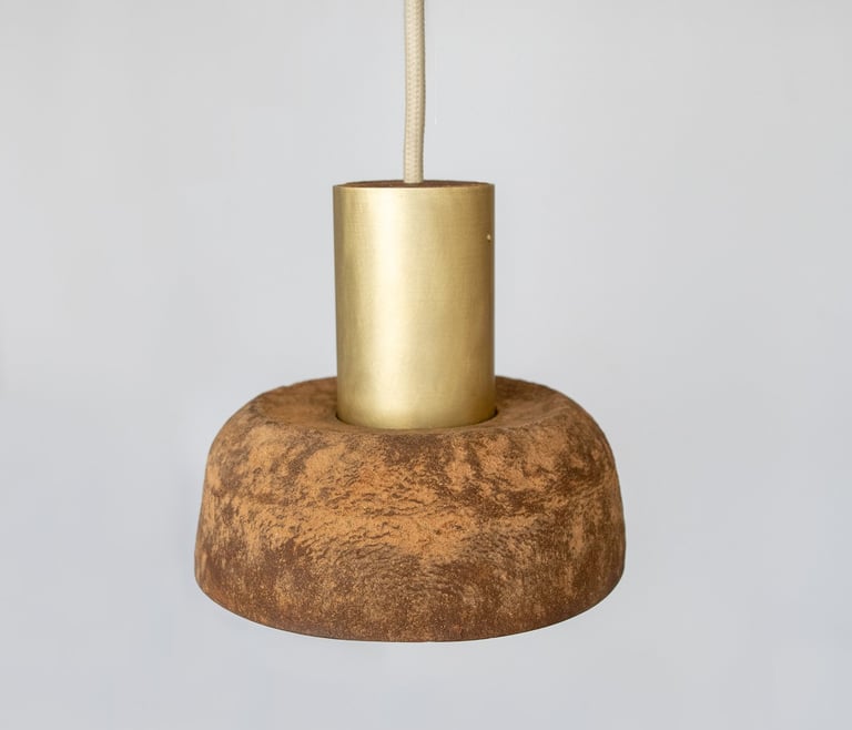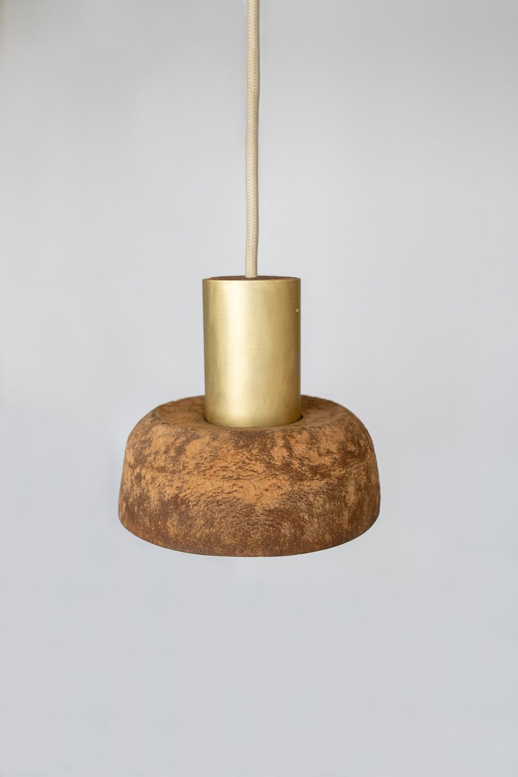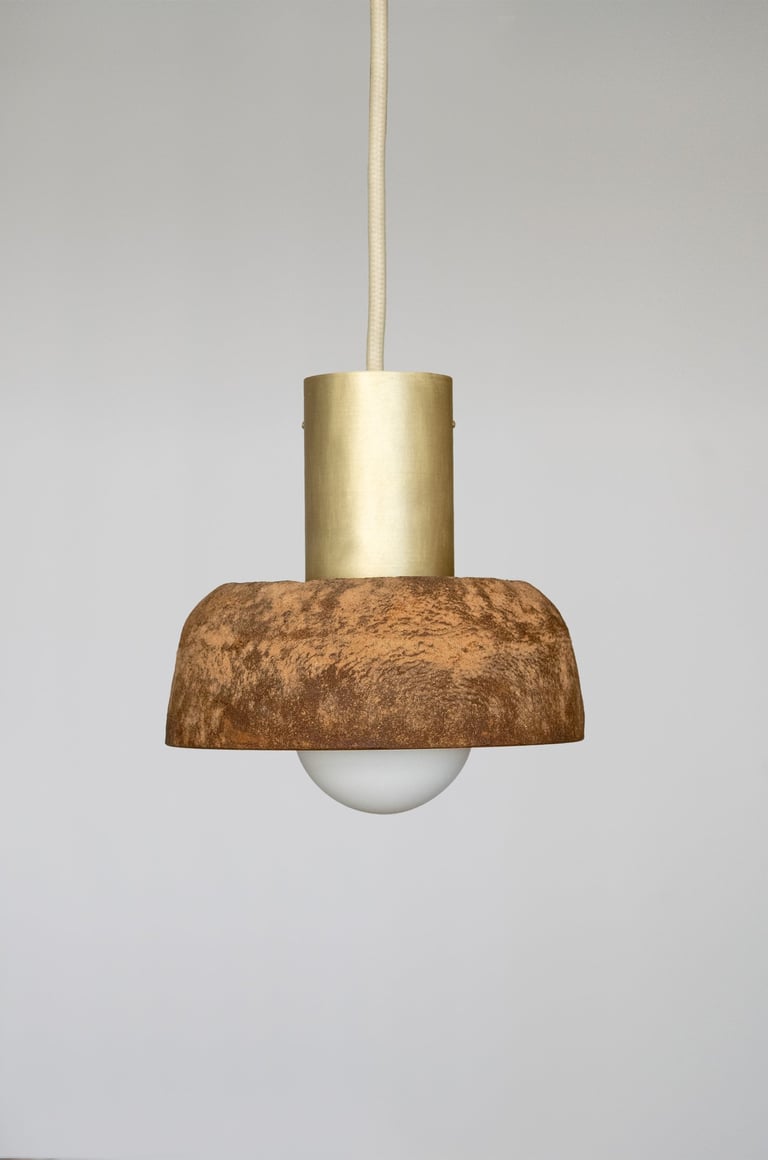 Raw and textured surface of a lampshade is accompanied with a matte brushed brass tube. Each lamp is made by hand and is one-of-a-kind.